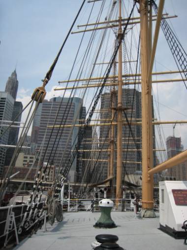 Following a 3-hour Amtrak journey from Malvern PA I arrived at South St via the subway train from New York Central on Wednesday at about 1pm. It was hot, about 92ºF, and very humid. The ‘Peking’ was alongside the quay and could not be mistaken. She is huge, both in length and height and beyond anything I had imagined. The bowsprit was close to and on the same level as the adjacent overpass, so it was almost impossible to get far enough back to get all the ship in shot. I paid my $8 and couldn’t wait to get aboard and explore.